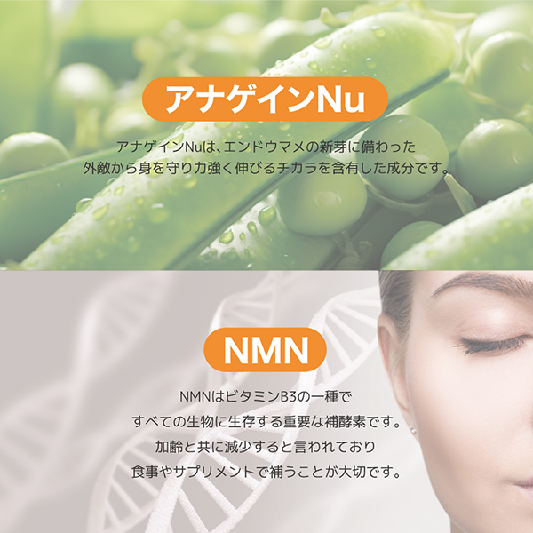 エンドウマメの新芽から抽出したアナゲインNuやNMNなどを配合。